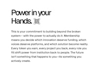 This is your commitment to building beyond the broken system-- with the power to actually do it. Membership means you decide which innovation deserveitsnding, which voices deserve platforms, and which solution become reality. Every token you earn, every project you back, every role you fill shift power from institution back to people. The future isn't something that happens to you--its something you actively create.